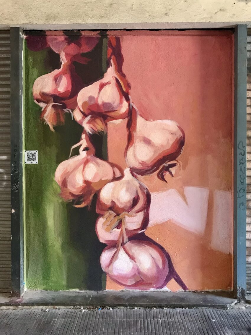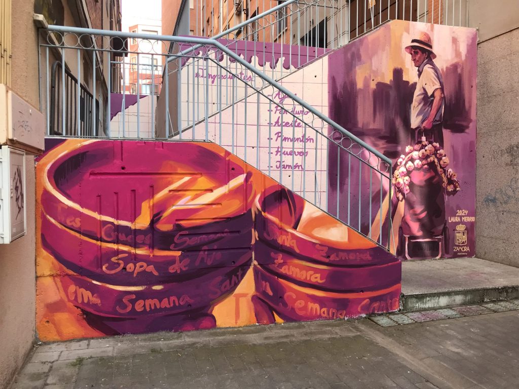 para el Ayuntamiento de Zamora un mural en relación a los ajos zamoranos, la feria y la gastronomía, que se puede ver en la calle Santa Ana en Zamora.