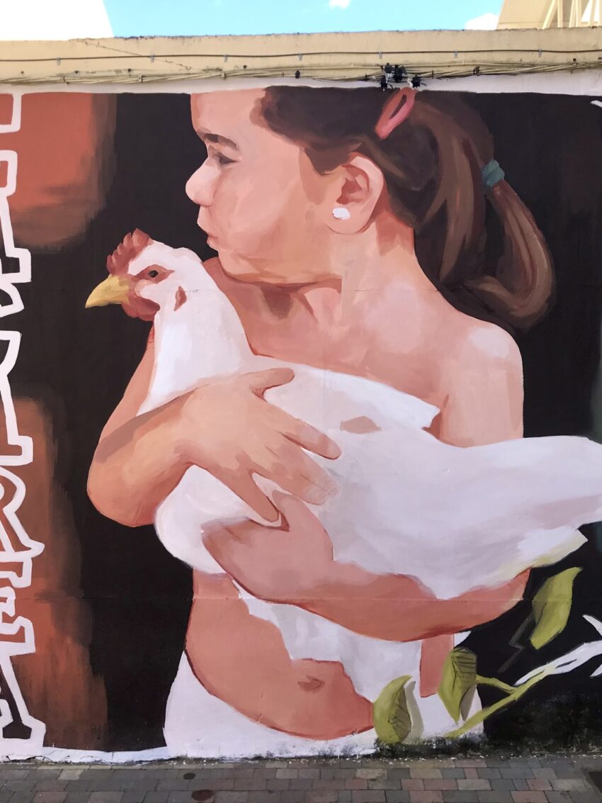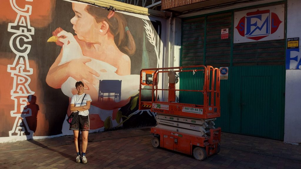 También tuve la suerte de poder volver a pintar en Manganeses de la Polvorosa, en Benavente, donde siempre me tratan estupendamente y la gente es súper entregada. Allí dejé plasmadas tres águedas con sus rodaos típicos. Participé en el festival ArtAeroRap de La Bañeza y coincidí con gente maravillosa que me ha aportado mucho. Allí pinté “Cacarea” que es una niña con una gallina (que soy yo de pequeña) con connotaciones más gráficas, ha sido el mural que más disfruté la verdad, nos trataron genial. También uno en Fonfría, Zamora, y el último que hice por la zona fue en Guardo, Palencia, esta vez fue una oveja llamada Lucera la protagonista del mural, con la montaña palentina de fondo, para el festival Pispajos, también gente super entregada y hospitaria.