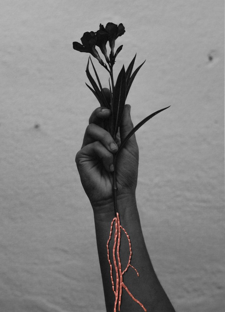 3. El tejido que aparece en la fotografía es un manto hecho por mi bisabuela de los retales que quedaban de los trajes de la sastrería de mi bisabuelo Inocencio. Porque ellas trabajaban, pero permanecían en la sombra. En esta foto he bordado, sobre la piel, las flores que hiló en el manto, haciendo un símil del cariño y los cuidados que proporcionaban las mujeres a sus familias.