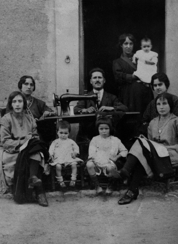 Sentir la tierra, pertenecer y ser uno con ella. Lo aprendemos desde el comienzo de nuestra vida: si conectamos con nuestra raíz crecemos y cuando nos desconectamos nos da miedo. En la tierra donde me crié, mi abuela, mi tía y mi madre cosían en casa. Mi bisabuelo tenía una sastrería en el pueblo y hacía trajes para la comarca. Es el que aparece en la fotografía, Inocencio, detrás de la máquina de coser. Debajo su hija, mi abuela Encarna. Al fondo, de pie, mi bisabuela con otra de sus hijas.