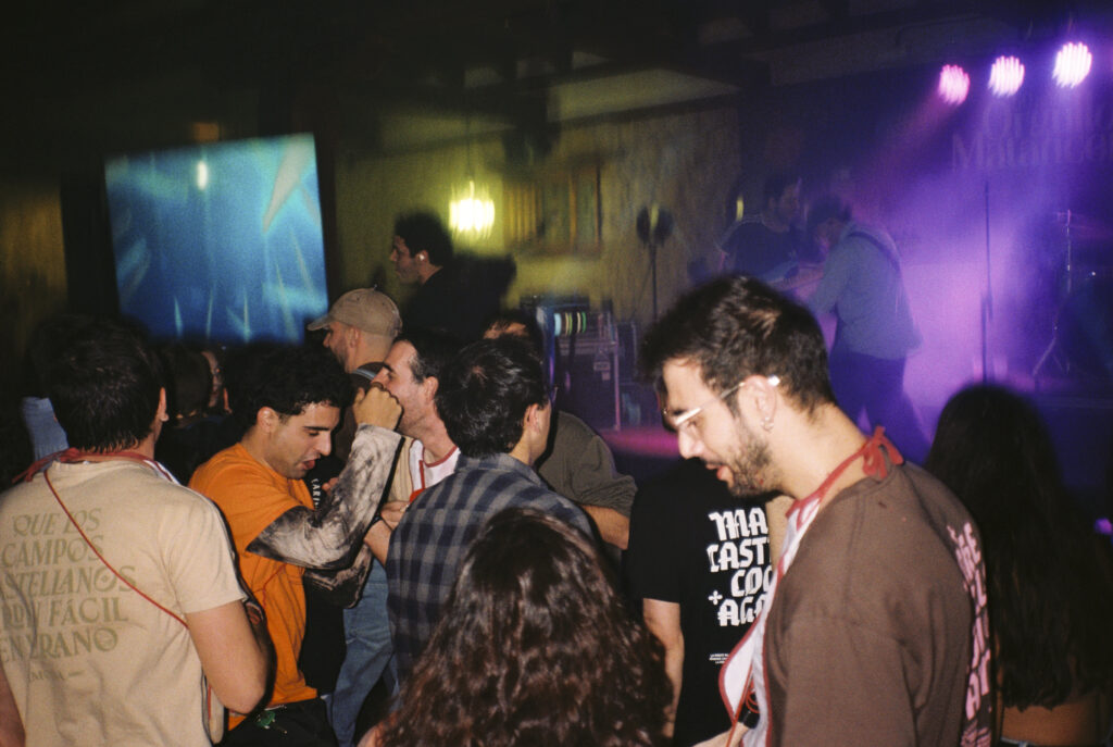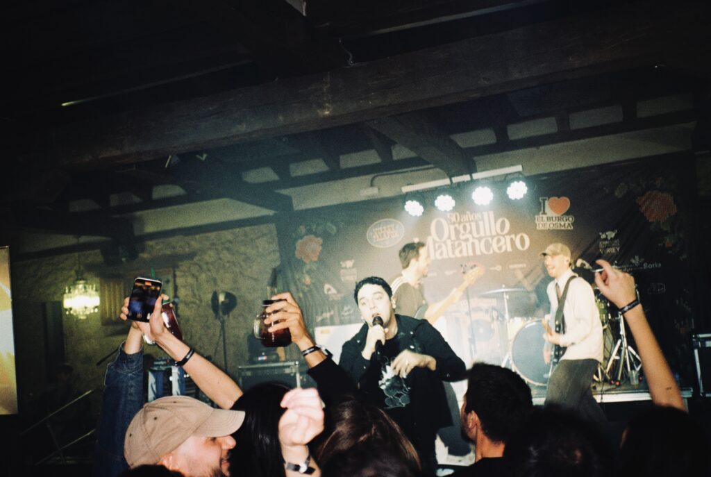 Para los postres ya estábamos todos de pie, nosotras repartiendo anís a quienes tenían nuestra camiseta y una conga infinita encadenando a todos los presentes, que de alguna manera nos sentíamos afortunados de tener la certeza de estar en el sitio y el lugar indicados ese sábado soleado de noviembre. Viva Soria. Nos pusimos a vender un poco de merch y esto nos sirvió para conocer un poco más a todos los que habéis venido. Saraut para vosotros. Para cuando empezó el concierto de Delameseta, los ánimos ya estaban caldeaditos, y Delameseta no se caracteriza precisamente por enfriarlos.