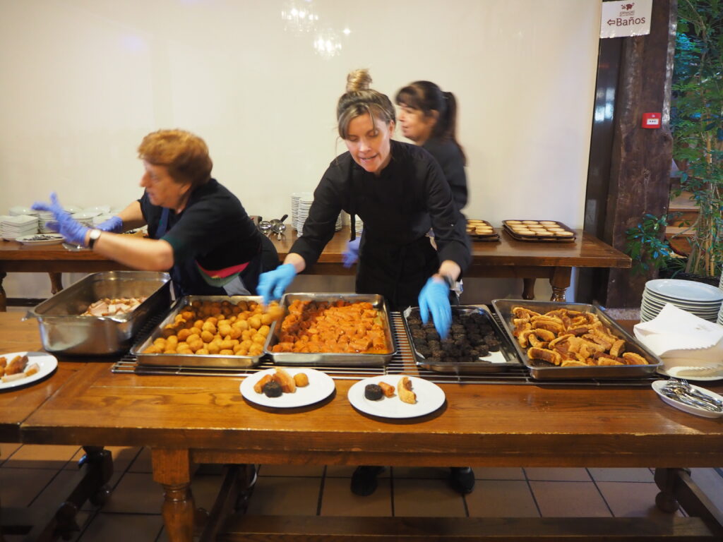 Unos entrantes matanceros (torrezno, chorizo y lomo de la olla, morcilla), unas alubias con costillas, huevos trufados, tacos de pulled pork (como explicaba Armando, las matanzas se adaptan bien a la cocina moderna de esos tiempos), albóndigas… no se olvidaron del postre (hojaldres con forma de cerdito incluido) ni de los chupitos.