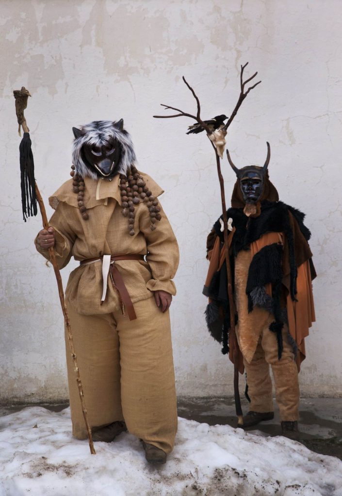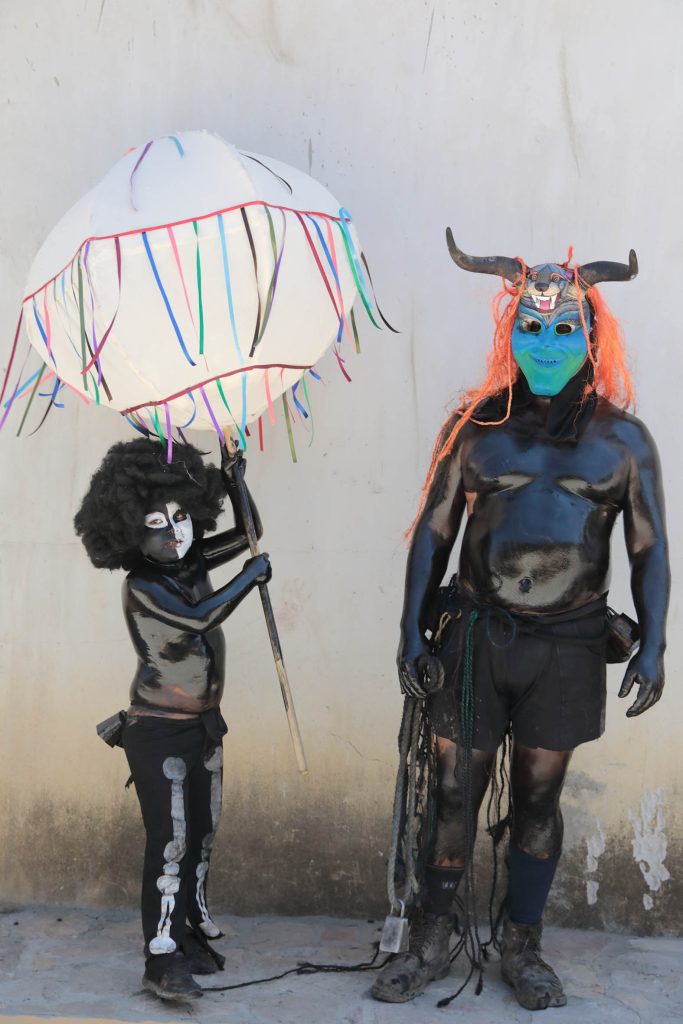 Por su parte, la tradición de Navalacruz parece remontarse a los tiempos prerromanos, a la cultura vetona, de origen celta, asentada entre los ríos Duero y Tajo, y conocida popularmente por sus famosos verracos, figuras totémicas con forma de toro, cerdo o jabalí. Desde entonces, sus transformaciones a lo largo del tiempo han dado lugar a una rica panoplia de personajes que se pasean por las calles del pueblo el sábado de carnaval. Entre ellos, además de los ya mencionados harramachos en sus distintas versiones (aquellos que se cubren con hojas, semillas y barro, y aquellos que lo hacen con pieles y cráneos de animales), encontramos a las carátulas, jóvenes cubiertos de tiras de colores que se inician en la tradición; al vaquero, que premia a los participantes más animados con vino, pan y chorizo; a la vaquilla, que persigue por igual a hombres y a mujeres (muchas vestidas con su tradicional manteo de ruana); y a otros tantos personajes que, quemando peleles y saltando el río (como muestras de esta celebración rica y profusa en detalles) llaman a la protección de la comunidad y a la fertilidad de la tierra.