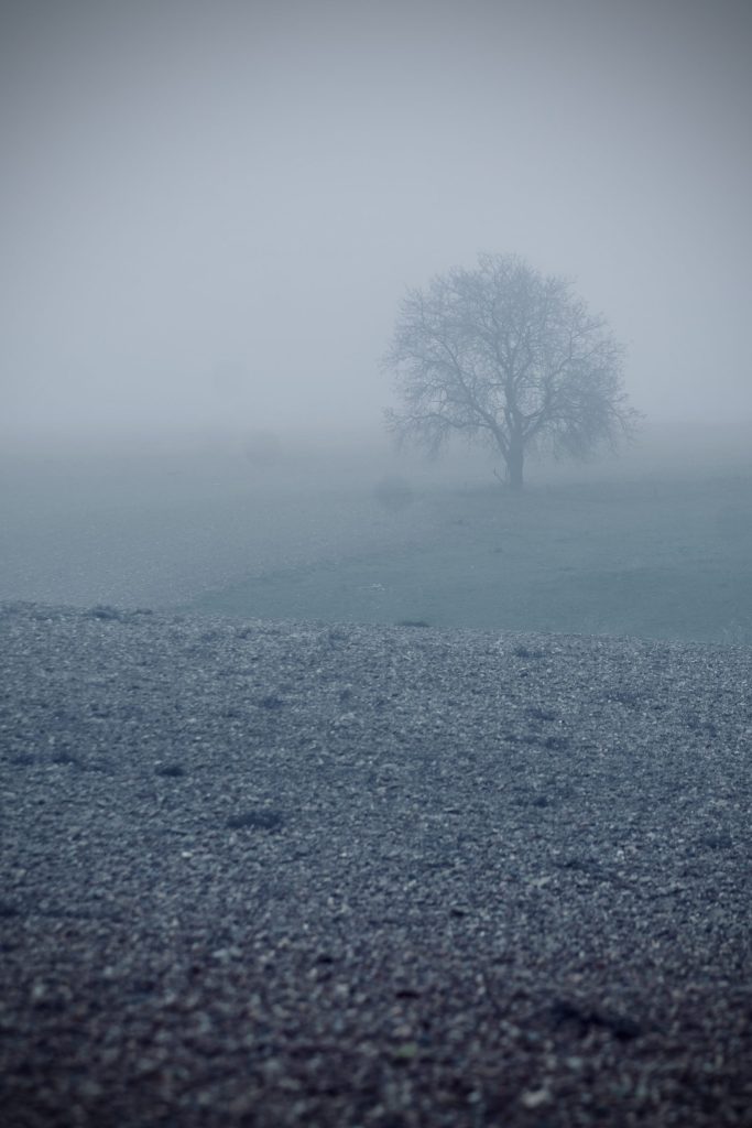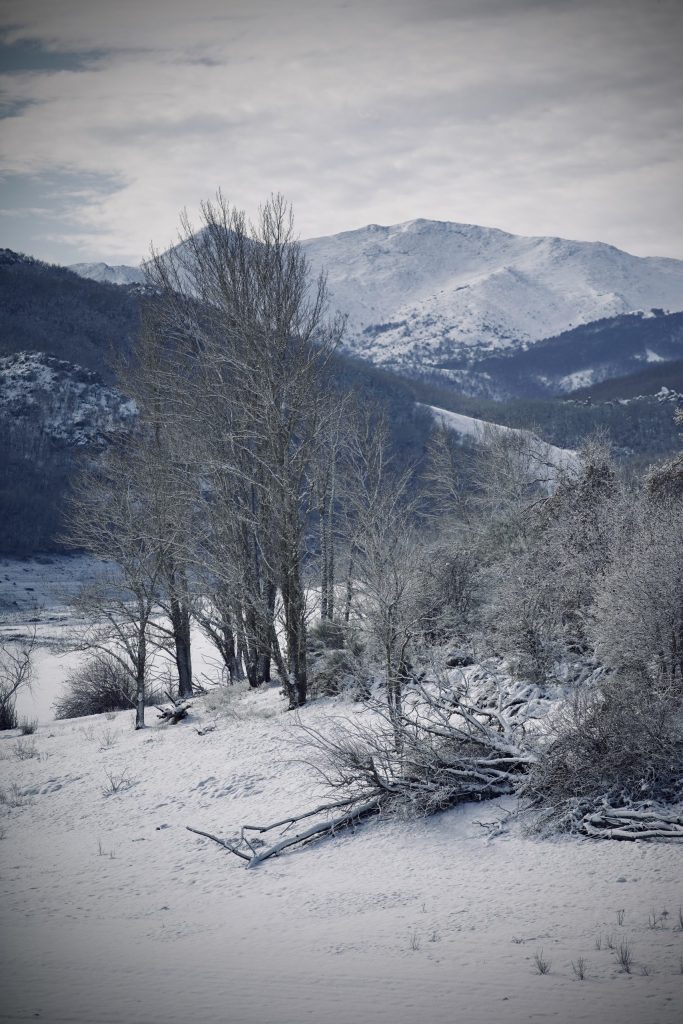 Con el cuerpo entonado por el café escapo hacia mi paseo por los caminos. Su presencia me provoca una sensación de frío intenso, pero también de calma, de tiempo detenido y de luz, una luz blanca, invernal. Tanto si está baja como alta, con ella, nuestra tierra desprende una inusual y desconocida belleza. En ocasiones oculta parte de los troncos y permite vislumbrar solo las copas, creando un decorado fantasmagórico y, sin embargo, acogedor. En otras, más escasas, acompañada del hielo, ofrece una belleza sublime. A pesar de la escasa visibilidad, a medida que avanzo, distingo tierras que empiezan a resurgir y otras que se mantienen a la espera. Me sorprende el silencio. Hoy ningún disparo lo rompe ya que ella se lo impide.