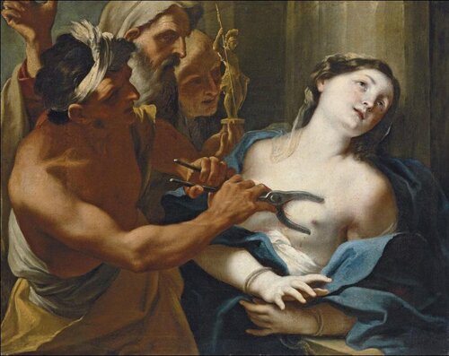 Además, Águeda no debía tener el don de la discreción. ¿Cómo se descubrió el pastel? Fácil, un procónsul romano quiso tema con ella. Ella se negó a ser la concubina del funcionario y no sé si por rebeldía o porque decirle “contigo no, bicho” hubiera sido aún peor, explicó el porqué: había decidido mantenerse célibe para siempre en honor al Dios cristiano, haciendo de su cuerpo joven, en lugar de un objeto de mercadeo, un templo a la nueva filosofía que prometía igualar a ricos y pobres. Él, muerto de rabia y de indignación, la hace juzgar por su herejía y en el juicio sus respuestas resultan demasiado firmes, casi provocativas. Le dan una paliza cuyo culmen es la mutilación de sus pechos. ¿Si has decidido ser virgen para que los quieres? supongo que fue el razonamiento clave del chascarrillo repugnante y brutal. Era un castigo simbólico, ejemplar. Roma sacaba pecho, quitándole a Águeda el suyo.