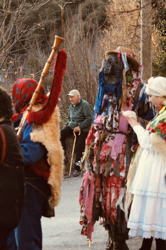 Lo primero que quiero aclarar, porque creo que está bien, es que nosotros no debemos estudio de nada. Aquí unos somos ganaderos, otros se dedican a la pizarra, otros se dedican al sector servicios, sanidad…otros ya son jubilados y otros son chicos que están estudiando, entonces, de estudios en profundidad sobre el tema yo no te puedo hablar, yo puedo hablarte de lo que es para nosotros, de lo que nosotros creemos y lo que nos han contado, y ya a mayores, pues de lo que hablan cuando vienen antropólogos y estudiosos, que ha venido mucha gente interesada en esto, pero yo personalmente no puedo decir de dónde viene, porque no lo sé. Lo que sabemos es que siempre se salió. Es una tradición que no se sabe cuando empezó, es de toda la vida, la gente mayor la recuerda y la describe como de toda la vida. Aquí se dice entroido, en toda la Cabrera Baja, rallando con Galicia, donde también se le llama el entroido y toda la zona de El Bierzo, que también. La gente mayor dicen que es l’entroido porque es la entrada de la cuaresma, porque ya después es el miércoles de ceniza y empieza la cuaresma. Nosotros no nos hemos preocupado mucho de buscarle explicación, sino que teníamos ese recuerdo y teníamos ese gusto de seguir con nuestra tradición y no dejarla perder.