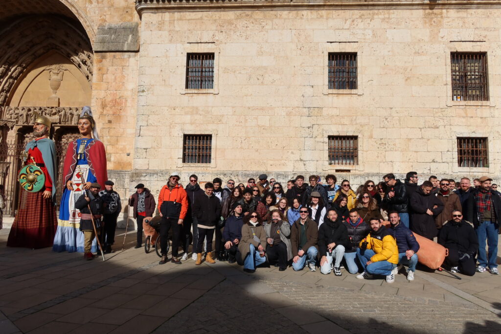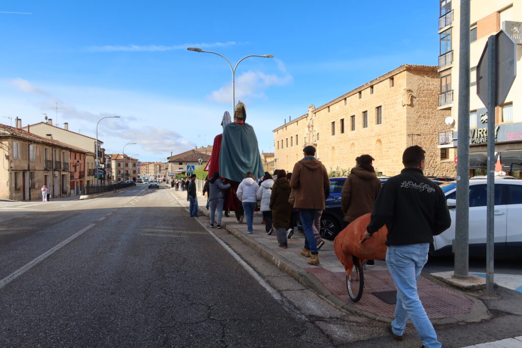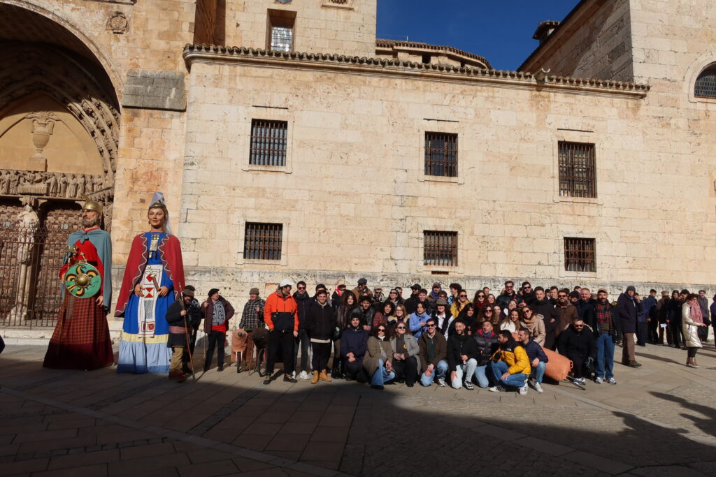 Dio comienzo el pasacalles. El tiempo nos bendijo con un sol radiante y un cielo turquesa, a pesar de lo que presagiaba la AEMET. El frío cortaba, pero no a nosotros, que no paramos de correr delante de los tres gruesos cochinos de fieltro, empujados por asistentes al evento (saraut infinito para todxs lxs que hicieron de cochinos). Los gigantes escoltaban la alegre y torpe comitiva -torpes y alegres ellos también, pues los portaban los amigos de Dj Plástico, de los que ahora hablaremos- y los dulzaineros la animaban. Armando, con su indumentaria histórica, explicaba el origen de esta tradición del Burgo: “En 1756…”. Tenéis la histórica anécdota completa en la crónica del Orgullo Matancero del año pasado. Las cervezas y los vermuts iban bajando y en cuestión de una hora estábamos en la plaza de la catedral, donde se hizo foto de grupo y donde nos encontramos con la Banda Municipal del Burgo de Osma, que se había reunido para celebrar Santa Cecilia, patrona de los músicos.