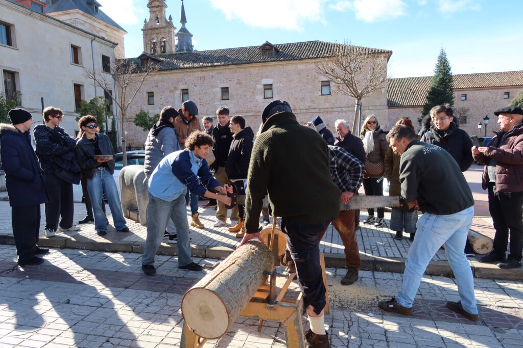 Después de la visita al Museo del Cerdo y antes del pasacalles con gigantes y cochinos, los carreteros reales impartieron un taller de tronzado de troncos con sierra de dos extremos, elemento que importamos de los suecos, con quienes tenemos, según nos dicen, más relación de la que imaginamos. Fue muy express, porque la agenda era apretada, pero muy divertido, enriquecedor y dejó a los que participaron un souvenir en forma de rodaja de pino.