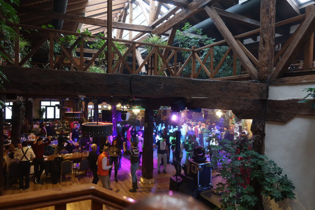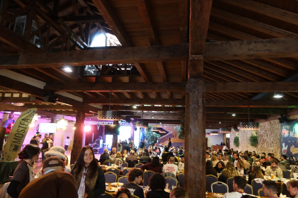 Después de la foto, en cuanto la nutrida y uniformada banda se puso en marcha, seguimos sus pasos de vuelta a la plaza del pueblo, donde apuramos un último vermut al sol antes de acercarnos al salón Castilla de los Diezmos (un antiguo granero perteneciente a la iglesia), donde tenían lugar comida y conciertos. El despliegue logístico de este año mejoraba el del anterior, con su doble escenario y sus baberos dispuestos en cada una de las sillas, pero lo verdaderamente impresionante de este salón es…el salón en sí. La descomunal estructura de vigas de madera. Éstas, por supuesto, no dejaron indiferentes a nuestros amigos carreteros: “Esto es un bosque. En la vida había visto yo un edificio así. Esto sólo se lo podía permitir la Iglesia en esa época, claro.” Estaban maravillados, contentísimos. Lxs invitados también, todo bailes y torreznos.
