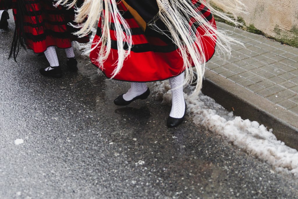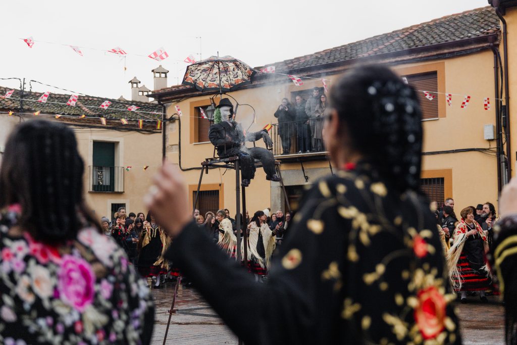 En fin, los bailarines se cortejan regios y elegantes, los pelos estirados, las espaldas también. Los manteos giran hipnóticos, rojo vivo por fuera, verde en el interior. La nieve se derrite y gotea copiosamente de los tejados. Algunas señoras ven el espectáculo desde su balcón, y alguna niña con su perro también. En cuanto las nubes abren un poco y dejan colarse un rayo de sol los bailarines sonríen anchamente sin poder evitarlo ¡¡qué frío estamos pasando los que solo observamos!! Vigilándolos como un socorrista en una piscina, desde su pedestal, el pelele espera -sombrero, castellanos y peluca verde- su hora de ser incinerado. En el escenario se canta y se toca el mortero, la dulzaina, el tamboril. De nuevo me parece que sería interesante ver más mujeres tocando música tradicional en esta festividad, pero sólo hay hombres. ¿Y donde están las águedas? Pues acabando la misa, pero de pronto irrumpen y pasan a compartir la plaza con los bailarines.