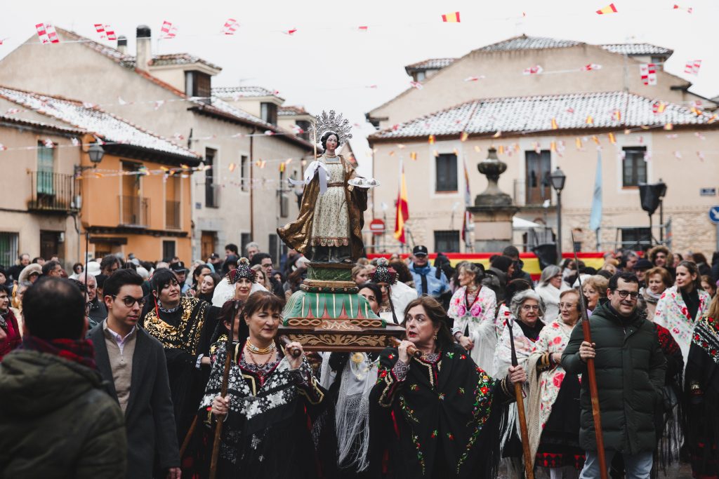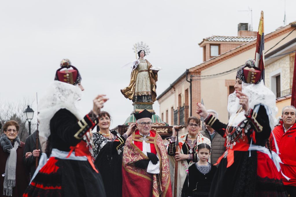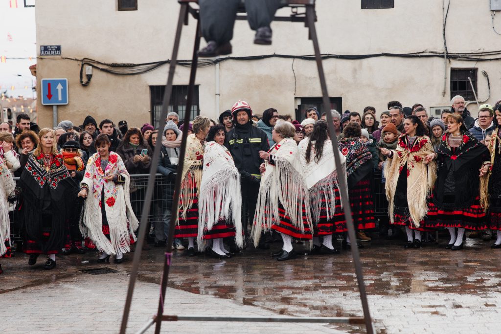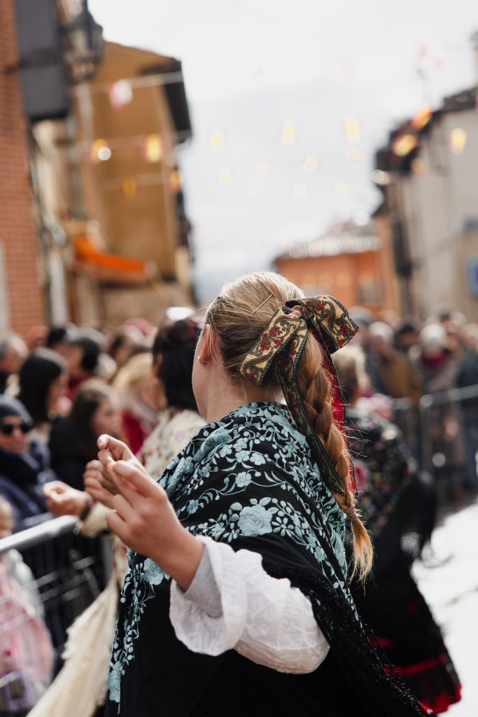 Pero sigamos con la procesión, que ya ha empezado y recorre unas calles empapadas, llenas de esa nieve marrón y traslúcida que tanto moja y molesta. A pesar de ello, la comitiva es una cascada de color y regocijo. Las mujeres bailan, las dulzainas suenan, el pueblo fiel procesiona sonriente, impasible al frío. Llegada a un punto próximo al Alcázar, la comparsa se detiene y las dos alcaldesas bailan unas jotas que, según me cuentan, se ofrecen al edificio, cuya importancia clave en esta celebración se entenderá leyendo el artículo sobre el mito de Santa Águeda