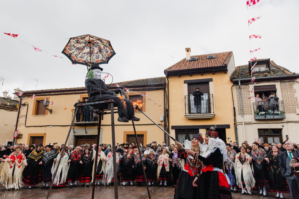 Feli me cuenta la historia de 1202 (en realidad una mezcla entre esa y la de 1400) que recogemos en el artículo complementario, donde nos explayamos en el mito. Pero efectivamente, la celebración de las águedas como un día al año de excepcional autoridad femenina (una concesión exigua, en mi opinión, si se tiene en cuenta la proeza de las zamarriegas) nace aquí, en Zamarramala, en este enclave maravilloso, en su día un lugar estratégico y fronterizo, de la sierra de Segovia. A lo largo de los años ha sucedido que muchas poblaciones han ido adoptando esta celebración, y fenomenal, porque es lo mejor que hay, y a Feli incluso le pidieron que fuera a Pinto, un pueblo de Madrid, a explicarles cómo había que hacer las cosas. Ahí tuvo ella que hacer mucho énfasis en que lo que se quema no simboliza al hombre y en que a pesar del título de matahombres…que el punto de la celebración no es ese. No sabemos si le harían caso del todo.