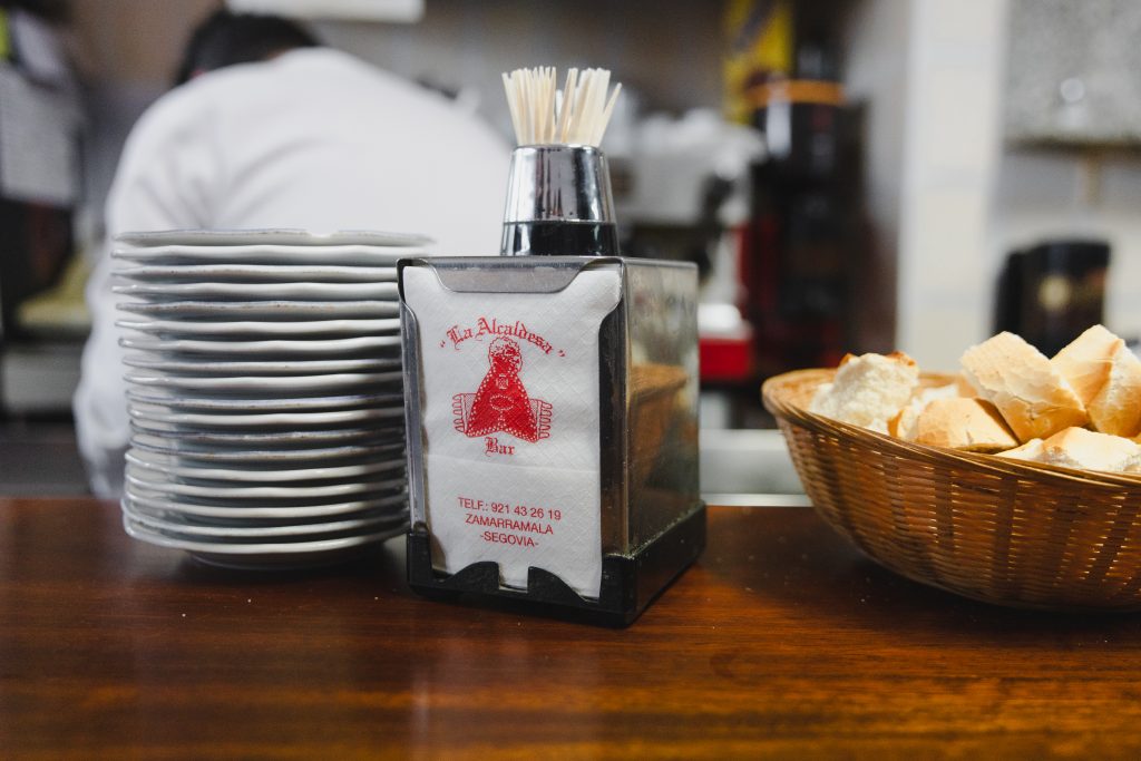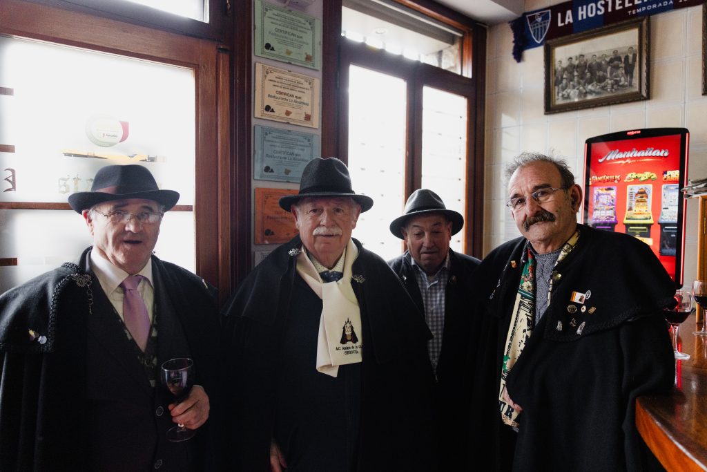 Les preguntamos si la celebración se ha ido masificando con los años y nos dicen que al contrario, que antes venía muchísima más gente, autobuses enteros, que no se podía ni andar por el pueblo. Cada vez hay menos, nos cuentan, porque se celebran águedas en muchos otros pueblos y la gente se reparte. Mientras hacemos cola para pedir nuestra segunda “tajá” (vino y un chorizo riquísimo), caemos un poco en nuestra propia trampa dando protagonismo a un grupo de hombres, pero es que no podemos evitarlo. Están en una esquina de la barra, envueltos en sus capas de gala. Sobre sus cabezas, una bufanda colgada en la pared que reza “La hostelería es gimnástica” (en honor a la gimnástica segoviana, pero haciendo un chiste en mi opinión buenísimo). Me llama la atención su atuendo, tan peripuesto, pues también llevan sombrero, y multitud de pines en la solapa, y les pregunto si son los dulzaineros. Se rien y resoplan preguntándose si les vacilo y me dicen que no, que son la Asociación de Amigos de la Capa Segoviana. Ahora me pregunto yo si me están vacilando, porque no lo había oído nunca, pero me dicen que no y el más elocuente me muestra un pañuelo que tiene anudado al cuello y que deja sobre su pecho la inscripción bordada “Asociación de Amigos de la Capa Segoviana” y, de nuevo, la imagen del alcázar.