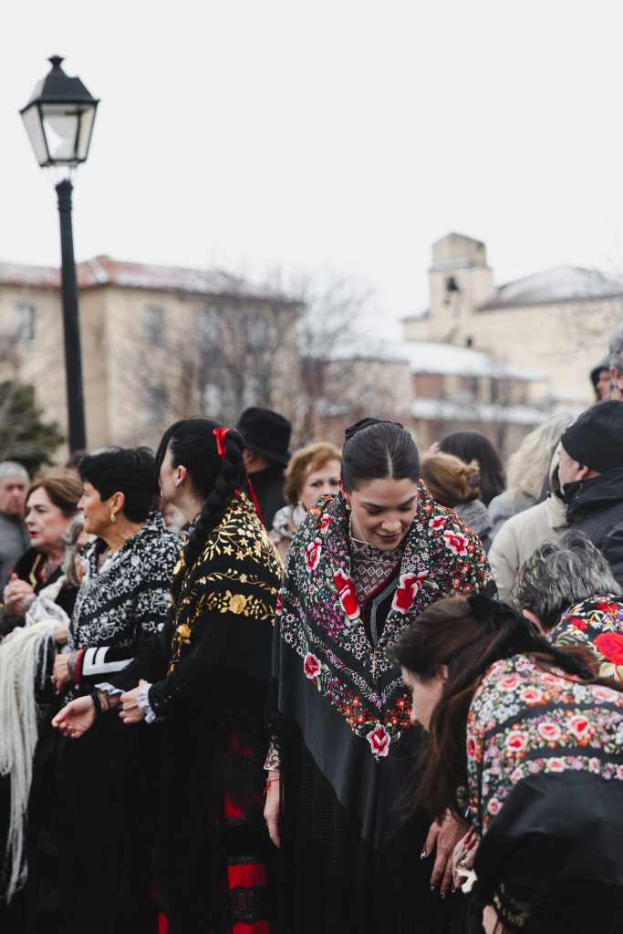 Según voy observando a lo largo del día, este es su modus operandi, su manera de intervenir: van formando una rueda jotera que envuelve ambientes y los toma, llenándolos de mantones de manila, lazos cuádruples de terciopelo y abalorios y manteos rojos, siempre rojos. Doy un bote en el sitio cuando escucho a un señor decir a mi espalda “Se jodió…ya están aquí las lobas”. Me rechina en el oído, pero me imagino que lo dice en broma. Eso de las lobas por otro lado tiene cierto poderío y efectivamente las águedas toman de nuevo posesión del espectáculo. Bailan un rato y después van subiendo al escenario junto a otras figuras importantes, entre ellas dos figuras que ya nos había parecido ver temprano durante la procesión: una, Miriam García, directora y presentadora de Me vuelvo al pueblo, el queridísimo programa de CyL TV. Los señores la reconocen al instante y le gritan desde abajo “me vuelvo al puebloooo” y ella se ríe.