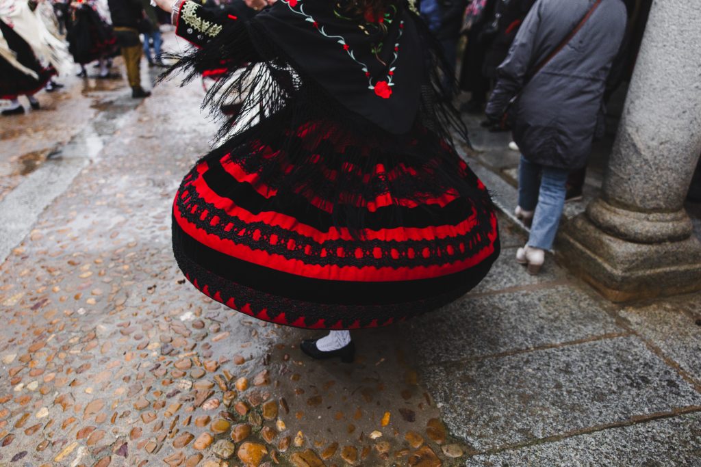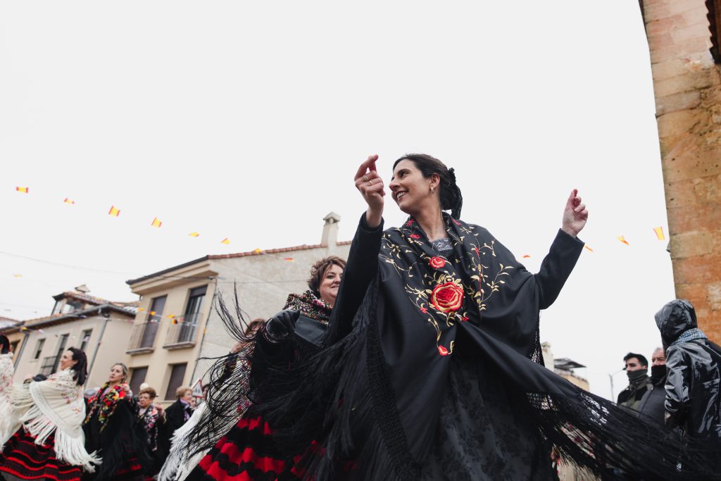 Les digo, para picar un poco, que no sabía que la capa segoviana fuera famosa, que yo conozco sólo la zamorana, la de Aliste. Balbucean de indignación y el que hace las veces de portavoz dice que sí, que esa es muy famosa pero que casi no se lleva luego, no se la ve por ahí en convenciones ni nada. Les pregunto si hay muchas convenciones y me dicen que sí, que hay una Convención anual de la capa ibérica que se celebra normalmente en pueblos cercanos a La raya, en la frontera con Portugal. El del año pasado fue en Miranda Douro a finales de octubre y este año se celebrará en Benavente. De nuevo Zamora, lo que yo decía. Entran al trapo a todos mis intentos de picarles y se indignan, pero ven que estoy de broma y me siguen contando que en estos encuentros antes se juntaban hasta 700  que ahora cada vez hay menos porque la gente es mayor, se va muriendo, y no llega gente nueva. Al poco rato, en la plaza, viendo el grupo de danzas bailar, veo a una chica joven con una capa castellana color borgoña e intento venderle la moto de que tiene que ir a estos encuentros, pero creo que más que quedarse con la copla se extraña de que le hable una desconocida que está sola en la fiesta (Lucía estaba en primera línea haciendo fotos). Quizá debería empezar a entrarle a la gente aclarando que soy periodista y no sólo una persona curiosa, pero lo cierto es que me siento más cómoda con la segunda definición.
