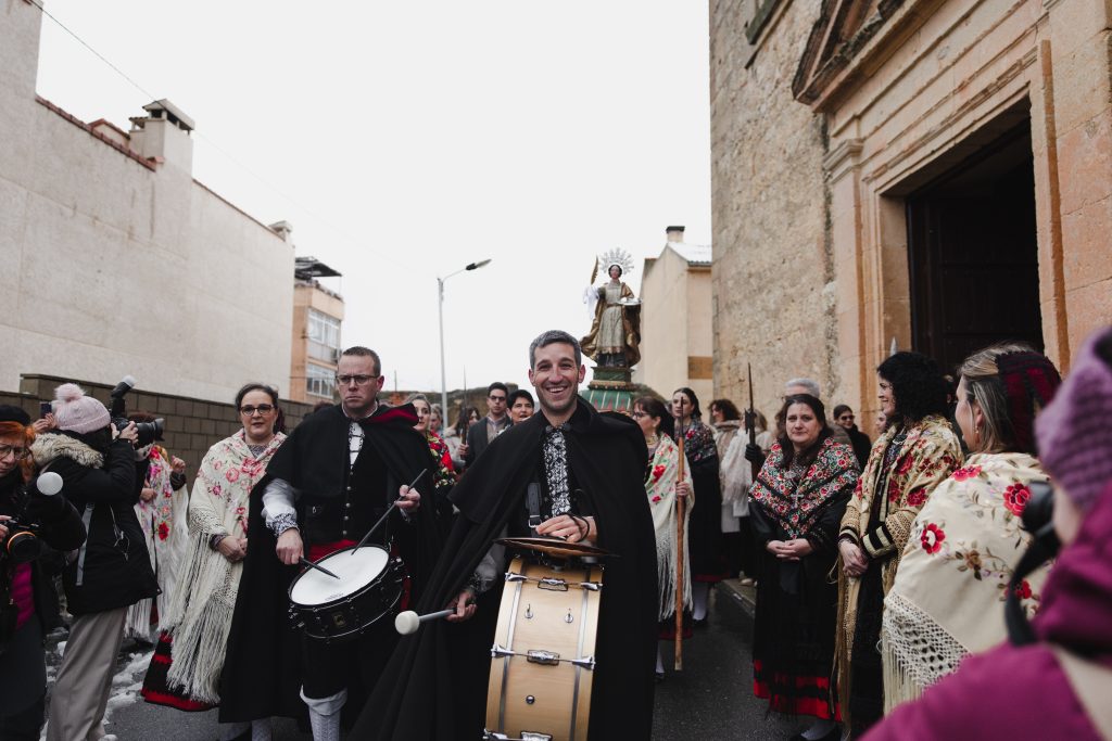 La seguimos por las calles, a ella y a la pista auditiva que son las dulzainas, y ambas nos llevan a la iglesia. ¡Allí esperan ya todas! Se saca la imagen de la santa (al principio, para nuestra sorpresa, la portean hombres, pero rápidamente le pasan el peso a las águedas más jóvenes), con su inconfundible bandeja de pechos cortados. Vamos preguntando cosas a media voz a las mujeres que responden positivamente a nuestras miradas curiosas y de permiso. Preguntamos si después de la procesión y el baile comen todas juntas y nos responden que no, que cada una con su familia, que antaño a veces sí que la alcaldesa organizaba una comida de todas, pero que ahora se iban dividiendo y que cuando si se juntan todas para comer es en la comida final, en La reconciliación, donde también están invitados los maridos.