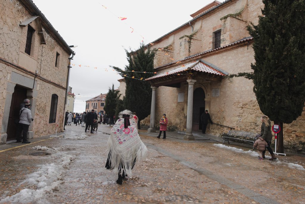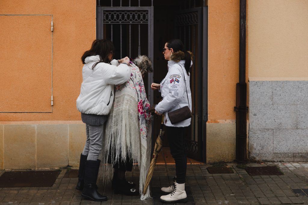 Nos preguntamos si estará muy masificado porque Zamarramala celebra las águedas más conocidas del país (después explicaremos porqué son tan importantes), pero al llegar comprobamos que la nieve ha conseguido disuadir a muchos de los habituales curiosos. Aparcamos pues, sin problema, entre coches con una buena nevada encima que los niños aprovechan para hacerse perrerías unos a otros. Solo hay que seguir el sonido de las dulzainas y a las mujeres de punta en blanco. Pronto captamos ambas pistas, la visual y la auditiva. La visual es una señora muy mayor a la que dos chicas asisten amorosamente en los últimos detalles de su atuendo. Le ajustan el lazo (que aquí en Zamarramala es cuádruple) y le colocan bien el mantón de Manila. Pendientes check…lista.