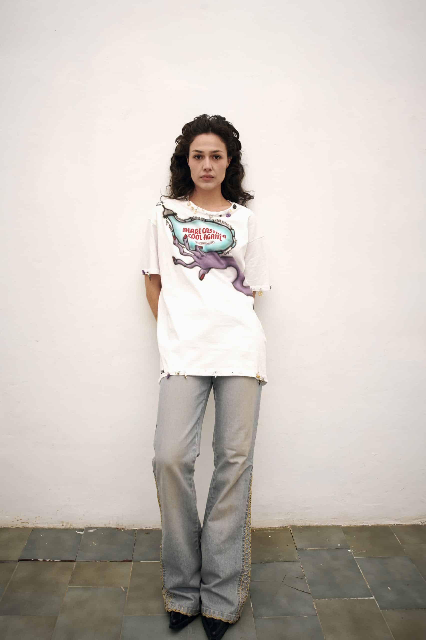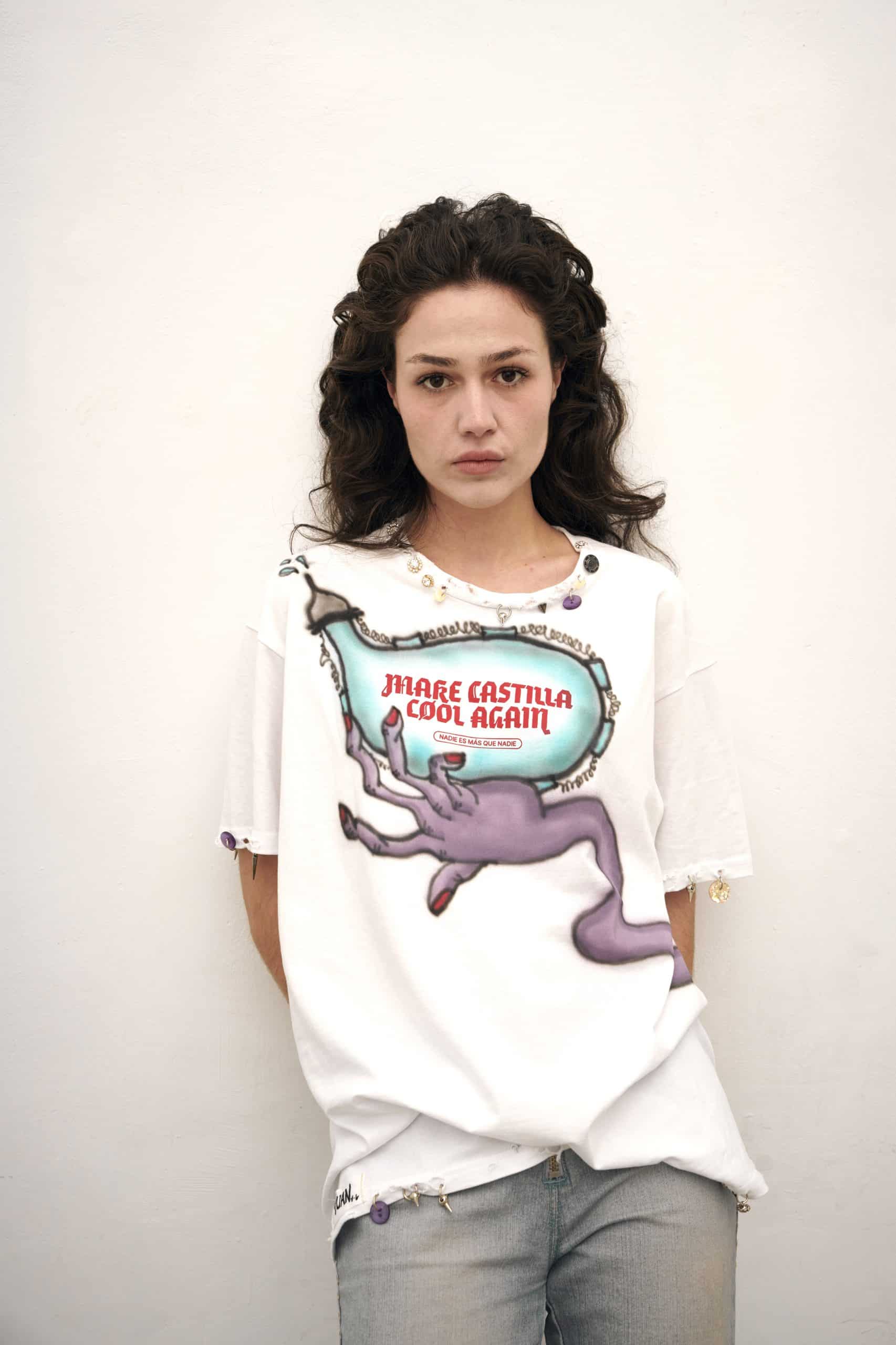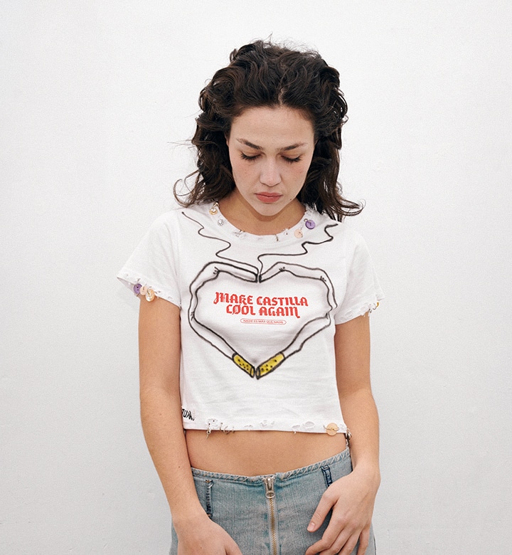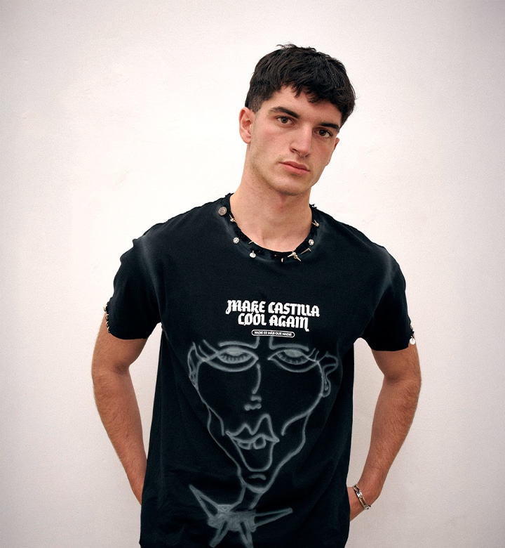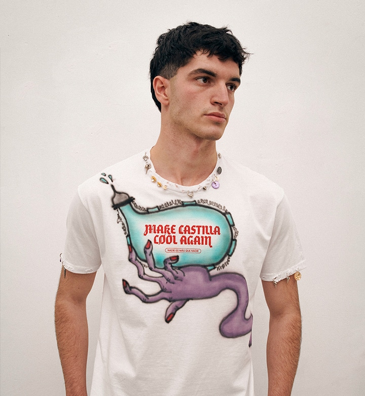 Pieza única customizada a mano con ilustraciones al aerógrafo y detalles metálicos por JUAN VG a partir de una de nuestras camisetas. Equivale a la talla L. Lavar a mano y en frío.