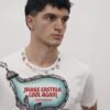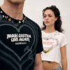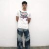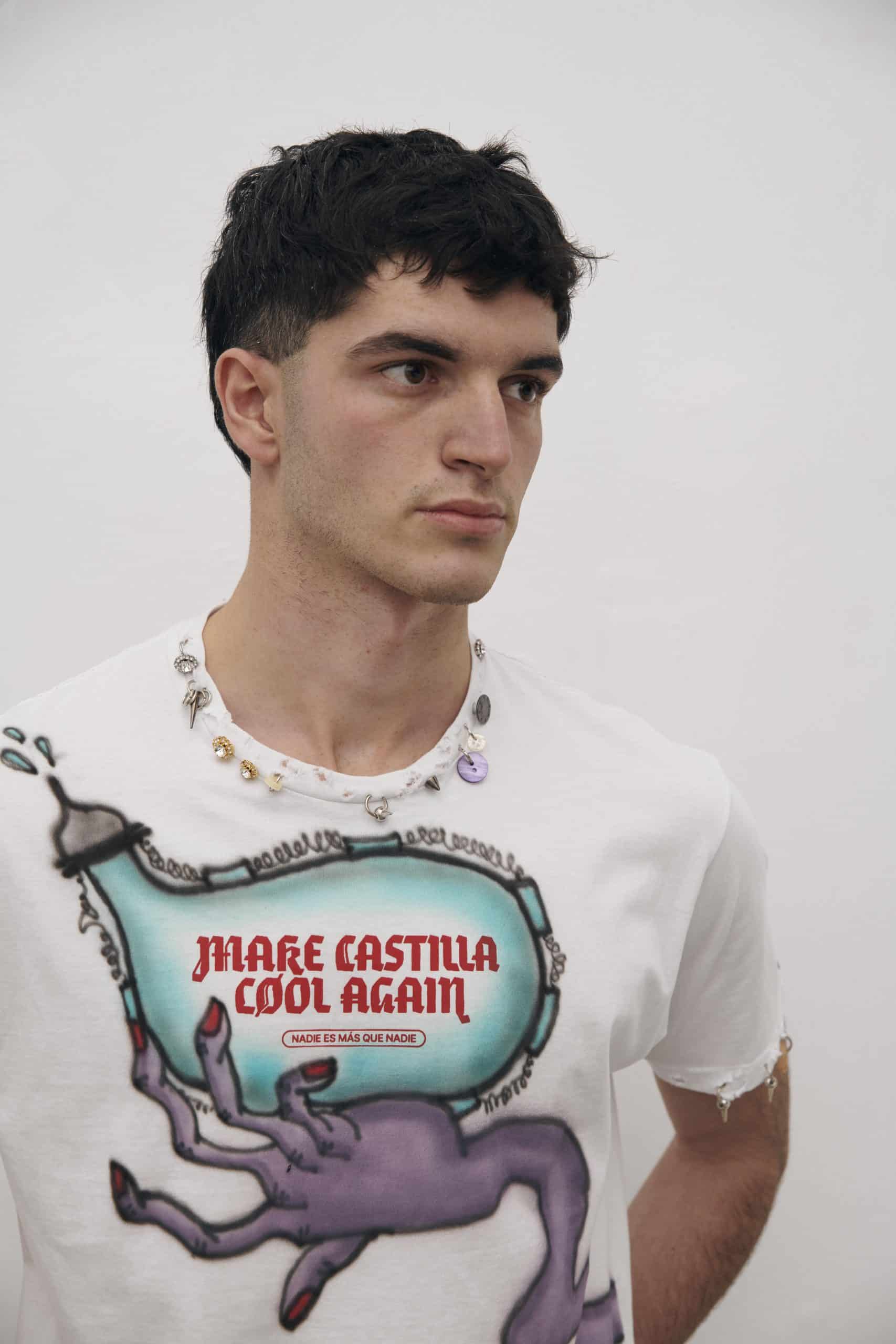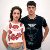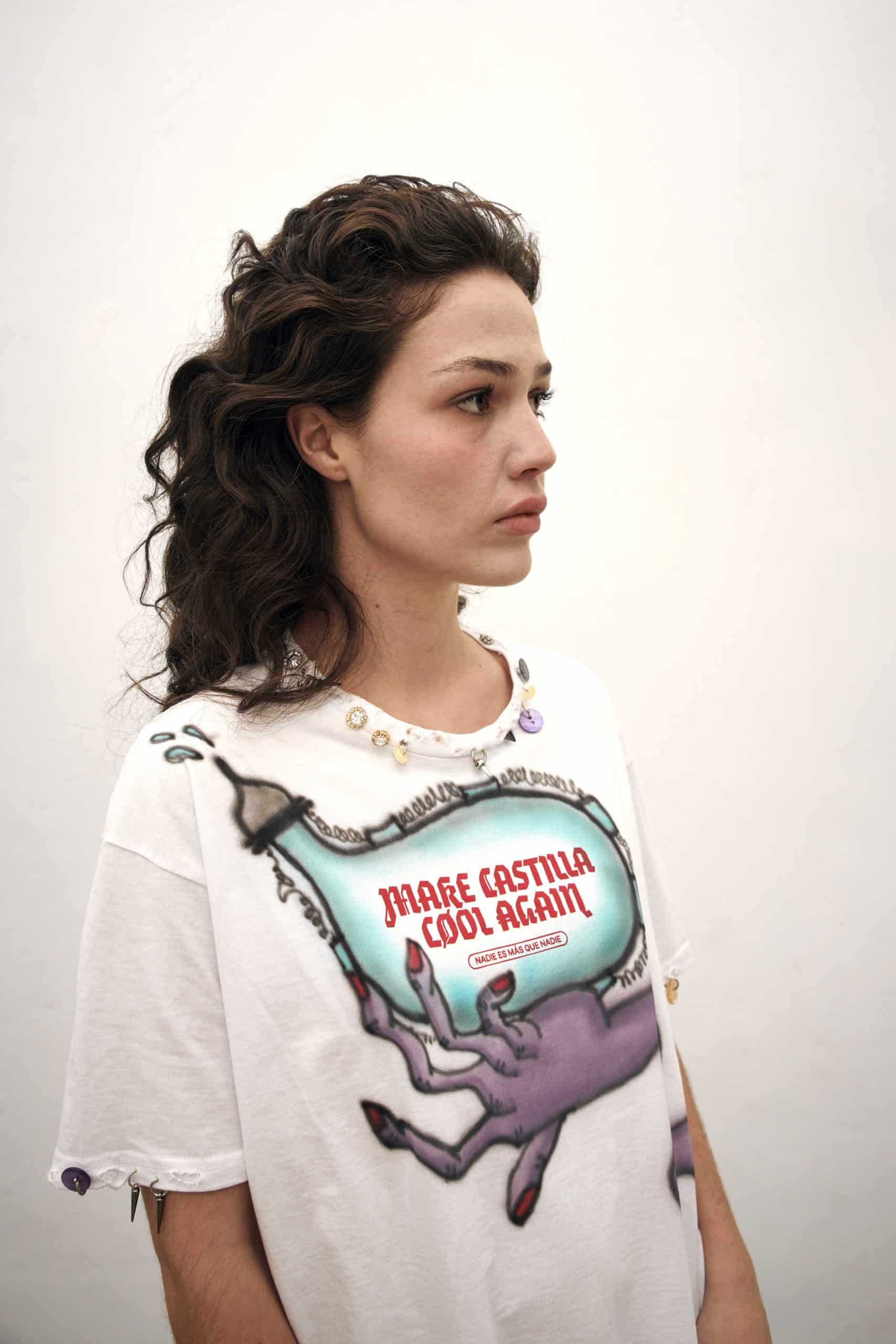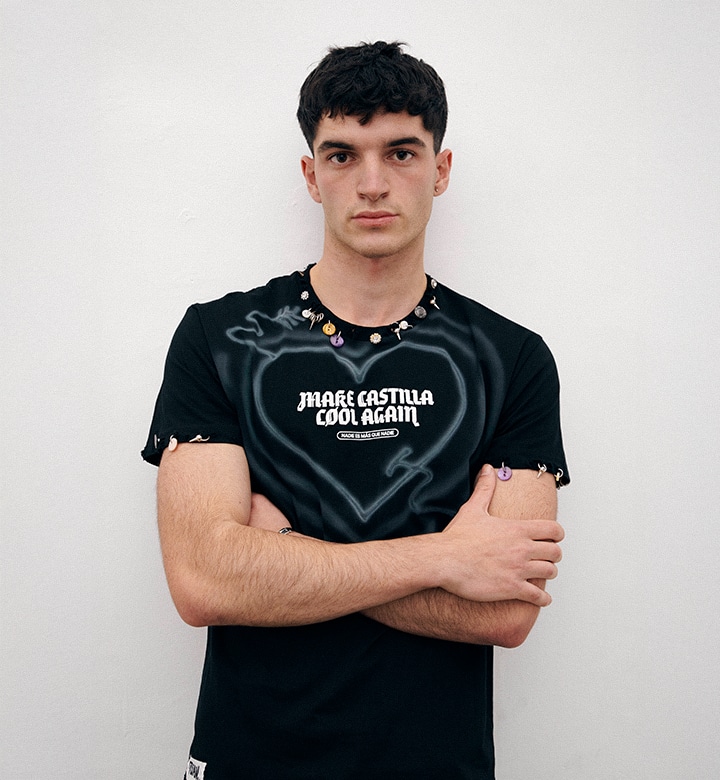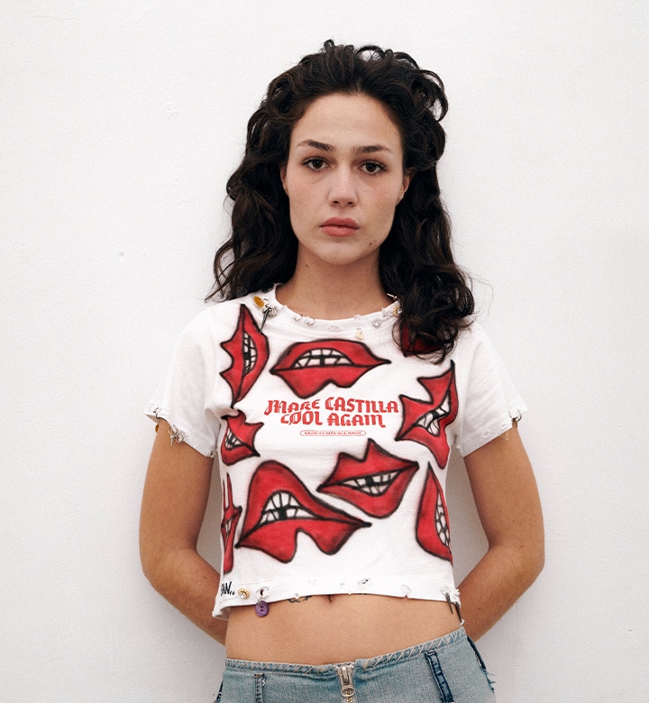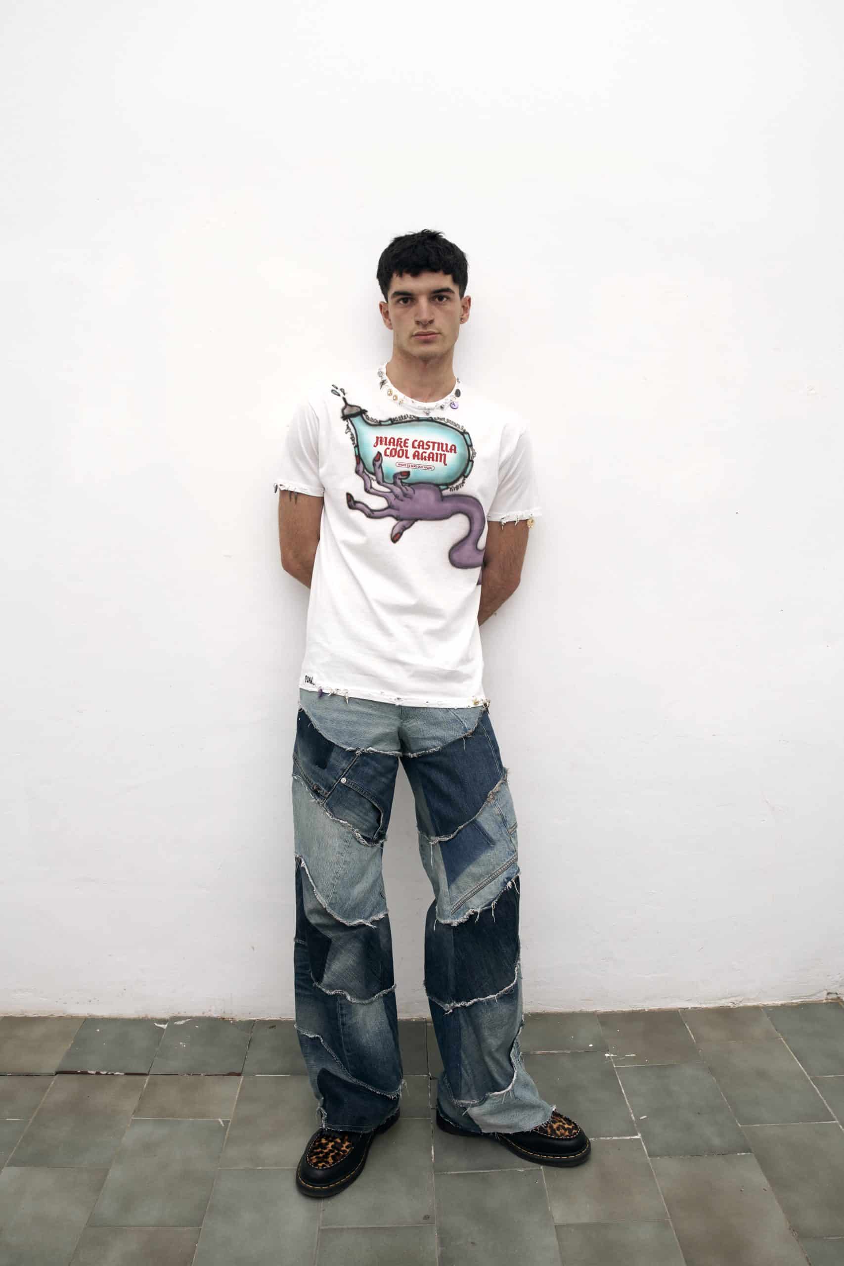 Pieza única customizada a mano con ilustraciones al aerógrafo y detalles metálicos por JUAN VG a partir de una de nuestras camisetas. Equivale a la talla L. Lavar a mano y en frío.