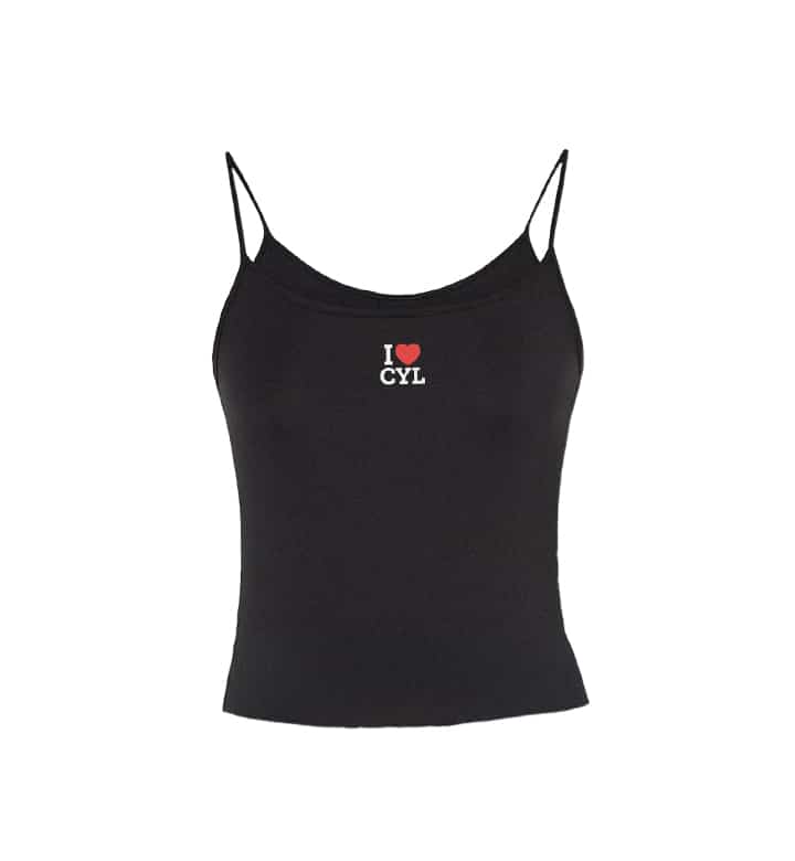 Conjunto tanga y top negros serigrafiados en blanco y rojo con la inscripción «I LOVE CYL