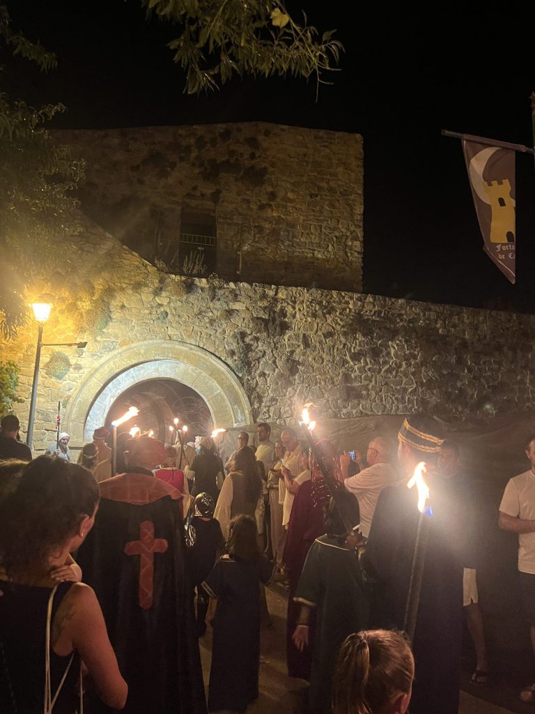 Con la hora de inicio del desfile casi encima, nos dimos cuenta de que no sabíamos a dónde teníamos que ir y un niño monísimo y super servicial vestido de caballero nos guió hasta el punto exacto. Todavía no tenía encendida la antorcha, pero la llevaba inconscientemente un poco en alto, como para iluminarnos el camino. No nos dieron antorcha, no íbamos disfrazadxs, pero lxs civiles teniamos permiso para perseguir a la comitiva. El desfile transcurrió, bastante emocionante y chulo de ver, con todas las generaciones juntas y disfrazadas, fuegos en ristre. Bordeamos la muralla de Cañete por fuera y concluimos en una de las retorcidas calles del arrabal en la que tuvo lugar una representación teatral. No escuchábamos nada y los ojos ya se nos cerraban, así que nos fuimos para la furgo.
