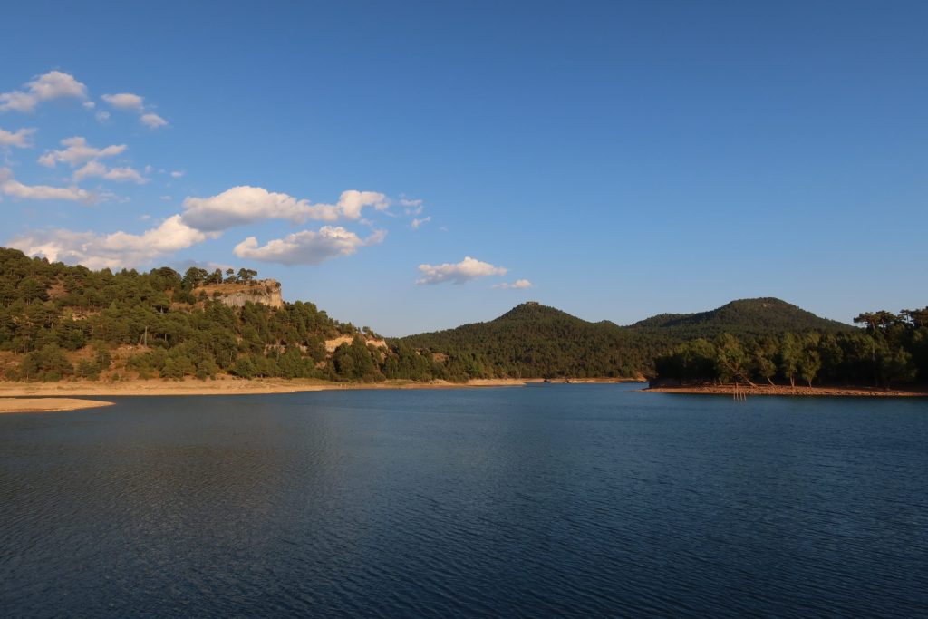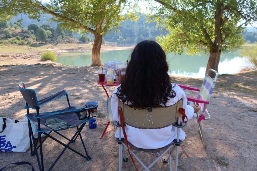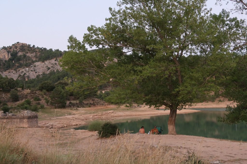 Mientras te bañas en el río ves Cuenca a lo lejos, con las casas colgadas en el punto de fuga del horizonte. A tu espalda, chiringuitos blancos con plantas y lucecitas decorativas. Suenan Los 40 principales, pero no pasa nada. El agua está francamente fría, pero en nuestra circunstancia, medio recocidxs por una furgo a 39 grados, resultó maravillosa. Nos tomamos un polo y agradecimos cada grado que se iba bajando de nuestra temperatura corporal. No nos entretuvimos mucho, aunque estábamos en la gloria, porque ese no era el spot que habíamos planeado para pernoctar. Había otra masa de agua apuntada en nuestro mapa.