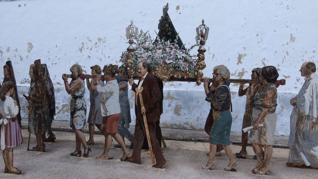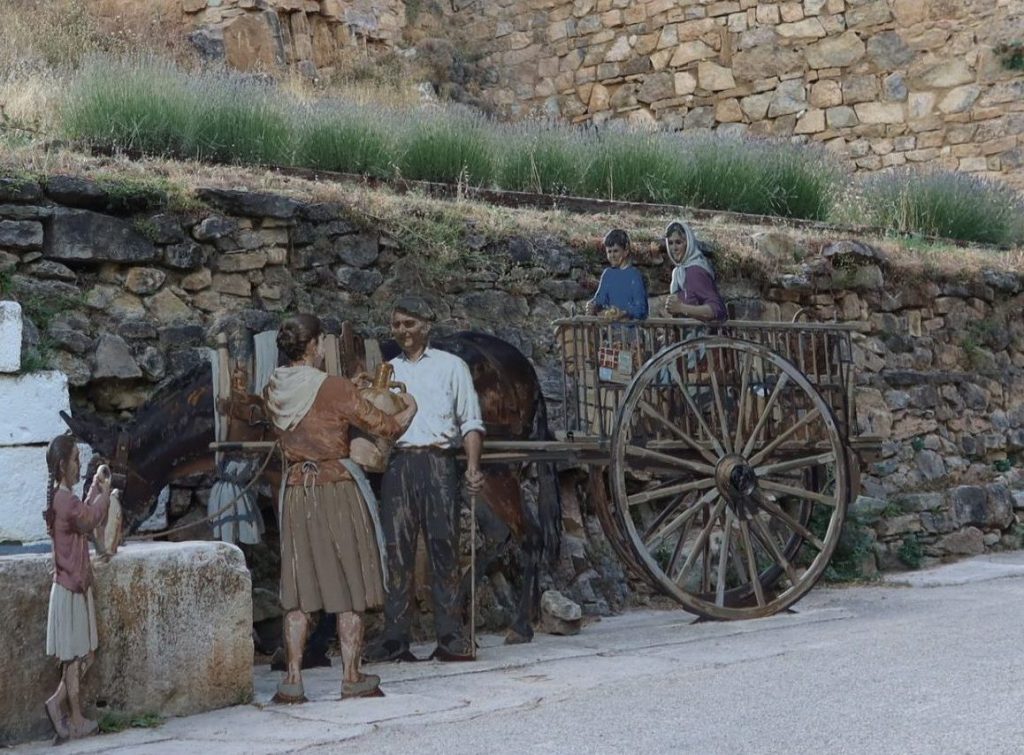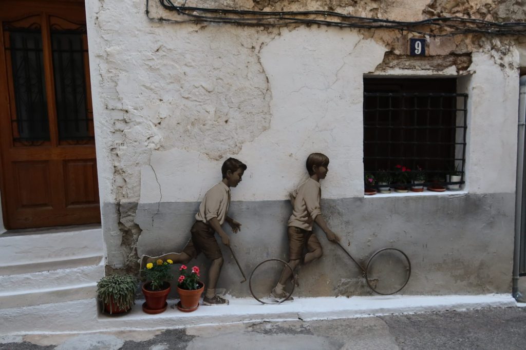 Ya entrando en Huerta del Marquesado habíamos avistado algunas piezas de Paisaje Ilustrado, la increíble serie escultórica del artista Luiz Zafrilla, que recrea la cultura popular tradicional (usos y oficios, personajes y tipos, ya desaparecidos o a punto de estarlo) a través de figuras de acero a escala real. Algo habíamos oído previamente sobre esta maravilla de trabajo gracias a la asociación Los ojos de la tierra, pero verlo en persona fue un lujo.