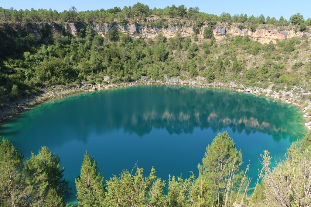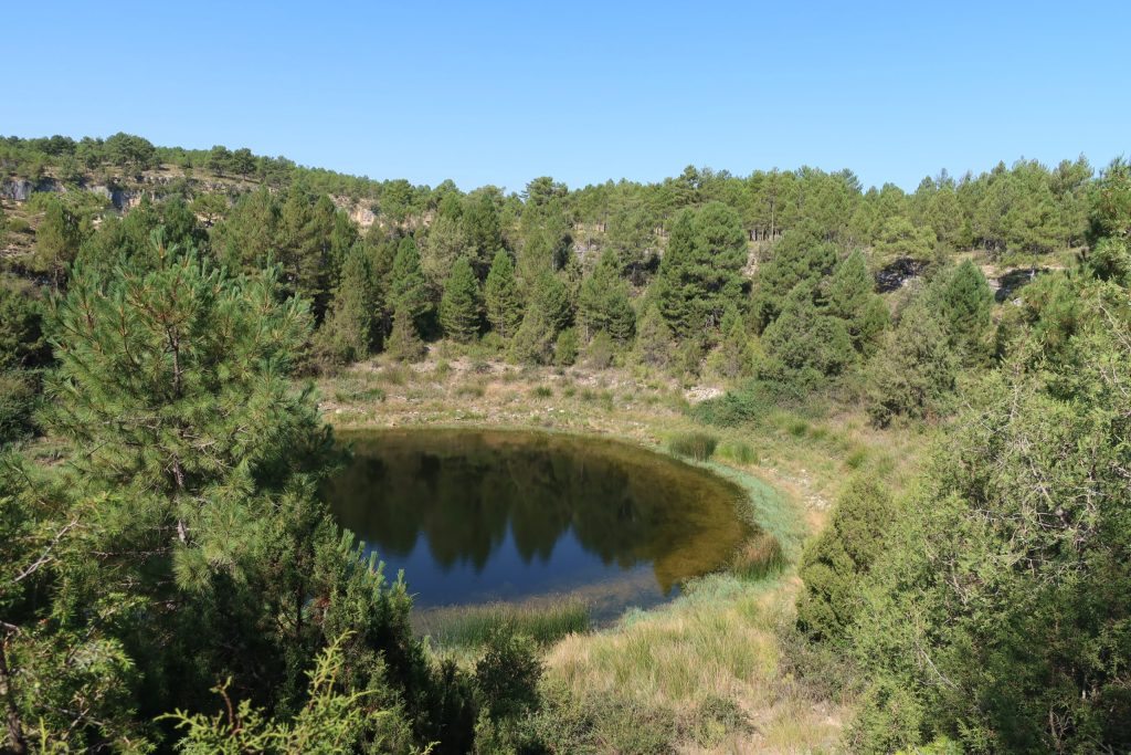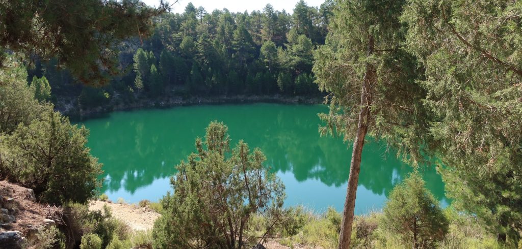 ¡Ah bueno! De camino, parada en la última masa de agua por visitar: las lagunas de colores de Cañada del Hoyo. Círculos perfectos en mitad del monte, cada una de un tono diferente (algunos verdes, como en casa, y nos consta que a veces se ponen rosas), pero desgraciadamente todas con un terraplén pronunciado que hacía imposible el baño. Así que, paseito de apreciación y retomamos camino a Cuenca. Teníamos previsto, además de darnos un último remojón en la playa (porque otra vez estaba haciendo un calor del infierno), conocer un poco la ciudad, y así lo hicimos.