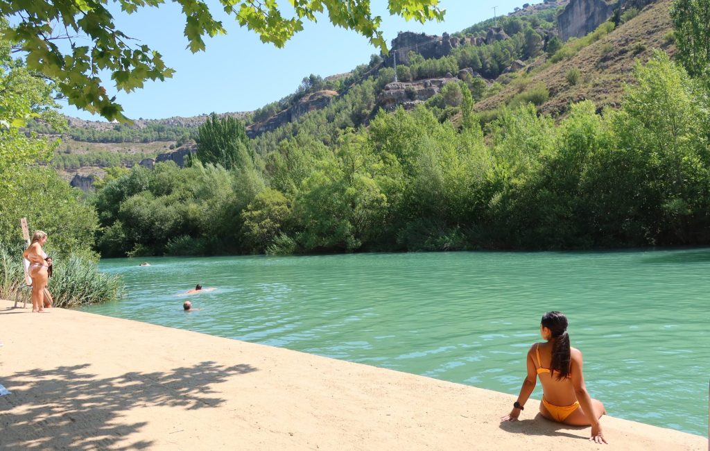 En la playa de Cuenca el agua es azul turquesa. Hay varios chiringuitos que siguen la longitud del río. Accedes al agua a través de unas escaleritas, de manera que da la sensación de que te estás metiendo en una piscina, excepto por las enormes paredes de piedra que la flanquean, por la vegetación, y por la infinitud del asunto.