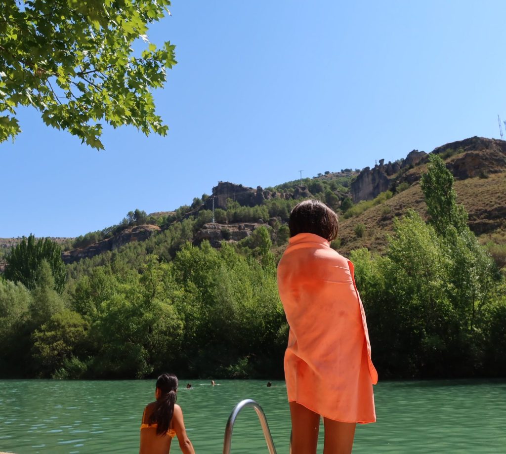 Ojo, porque nosotras somos de Valladolid, donde -técnicamente- también hay una playa. Lo malo, todo el mundo sabe: en el Pisuerga no te puedes bañar porque está más sucio que el palo de un gallinero. En la playa del río de Cuenca, el agua es azul turquesa. Resulta que en Cuenca, en general, lo normal es que el agua sea azul turquesa. Estó a mí me sorprendió. En nuestra Castilla el agua es verde, o dorada si nos queremos poner más poéticos, y puede ser azul oscuro si se trata de embalses, pero rara vez es turquesa. Incluso el lago de Sanabria tiene un color azul plomizo, distinto a éstee