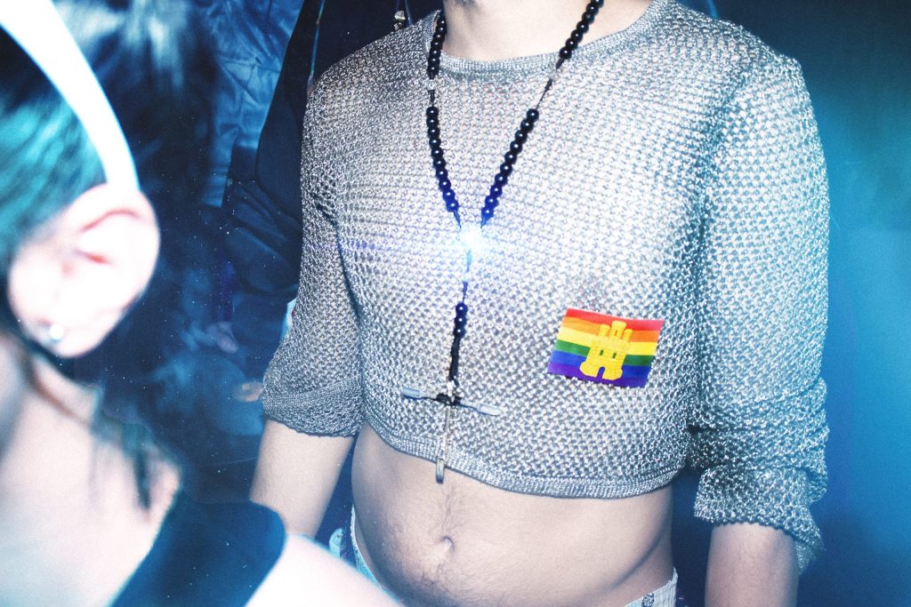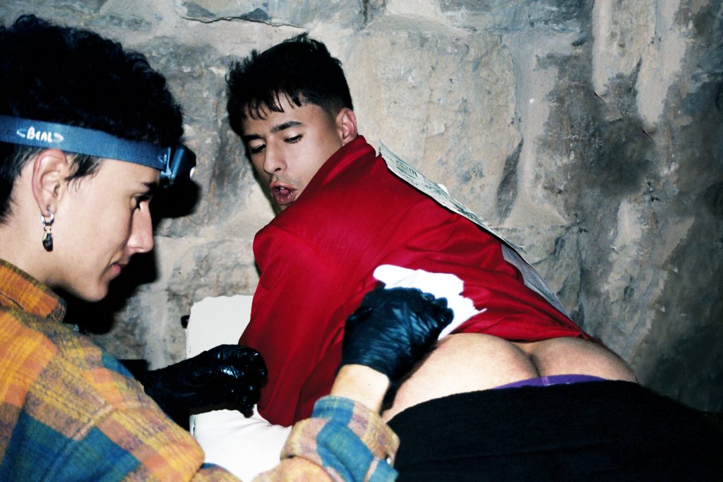 Hubo performance colectivas, hubo partos, hubo perreo hasta el frío y húmedo suelo… y, aún así, San Sebastián se fue con todo. Dos modestos azafatos le despojaron de su capa y entonces apareció, torso desnudo y flechas clavadas, sangrando purpurina roja. Desfile de voguing hasta el final de la pasarela de piedra, media vuelta y ¡chas! cintas con la bandera arcoiris brotando por sorpresa de sus muñecas, mientras otro azafato, con disciplina marcial, proyectaba nuevas flechas a su torso ofrecido. Mas voguing entre erótico, altivo y agónico y finalmente, la caída y muerte (no es voggin si el bailarín no termina casi fundiéndose con la línea horizontal del suelo). Literalmente podría haberme quedado afónica para siempre de tanto gritar. Todxs lxs presentes corrimos el verdadero riesgo de quedar completamente ciegxs tras tanto deslumbramiento. Menos mal que tenemos seguro. Eso es lo único que sacamos en claro, además de otra cosa: Todxs lxs santxs en el castillo no es una fiesta, es una performance colectiva.